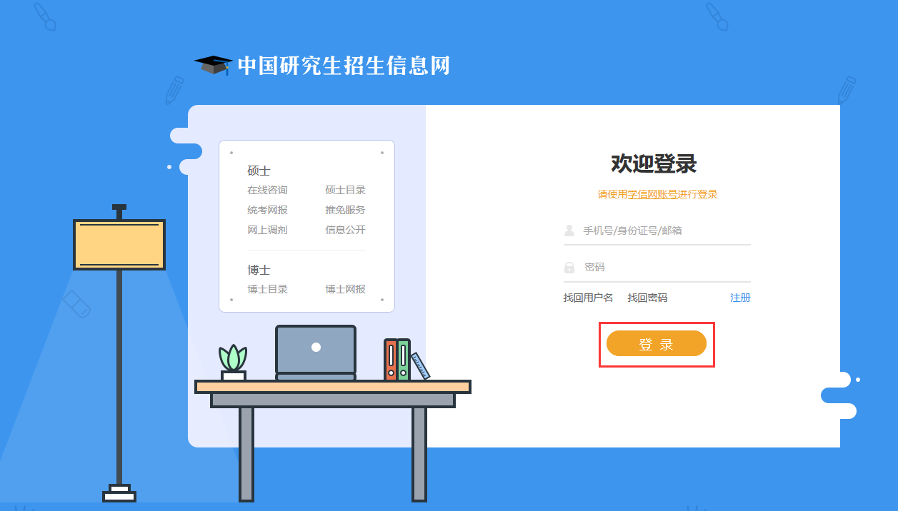 打開(kāi)研招網(wǎng)首頁(yè)后,用你的學(xué)信網(wǎng)賬號(hào)登錄網(wǎng)報(bào)系統(tǒng),沒(méi)有學(xué)信網(wǎng)賬號(hào)的考生,需要注冊(cè)一個(gè)。
