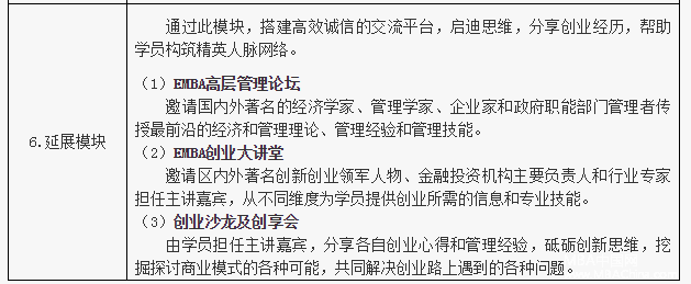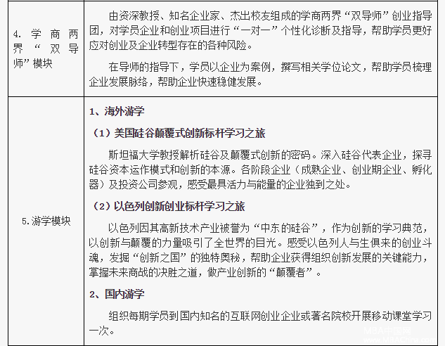 創業EMBA課程體系將課堂教學、案例討論、創業分享沙龍、大講堂、名家論壇、實戰模擬、企業參訪、國內外游學等教學方法有機結合。通過系統的商學教育,培養學員的創新思維、全面提升學員的管理水平、完善創業企業發展所需要的各種專業知識、提高在創業創新過程中的決策能力。