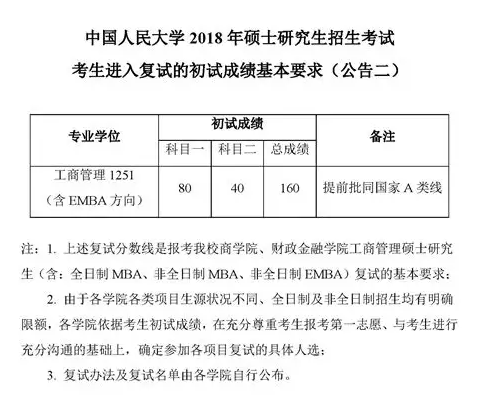 中國(guó)人民大學(xué)2018MBA分?jǐn)?shù)線已發(fā)布,總分為160,英語(yǔ)為40,綜合為80.