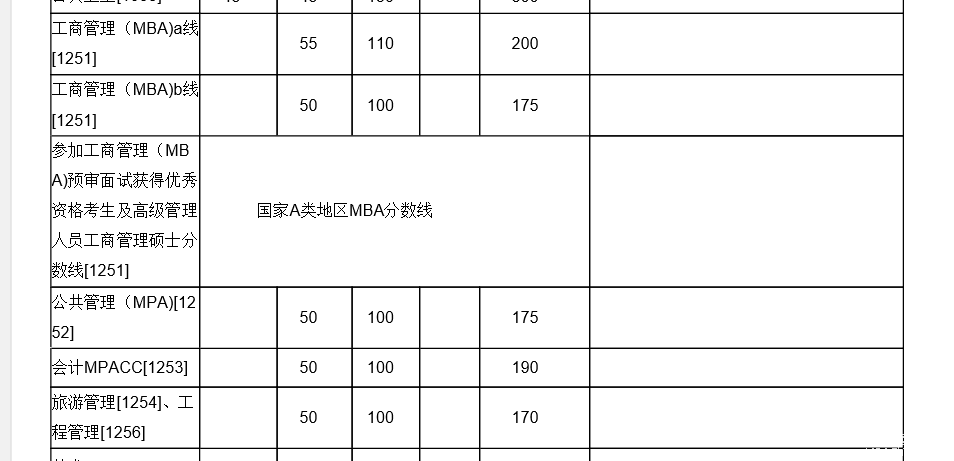 工商管理(MBA):提前批:國家A線 A線:200/55/110 B線:175/50/100