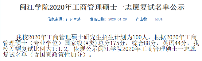 閩江學院2020年MBA復試基本分數線:175/44/88