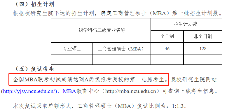 南昌大學2020年MBA復試基本分數線:175/44/88