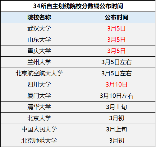 3月15日發(fā)布的除了國(guó)家線,許多同學(xué)們最關(guān)心的就是34所自主劃線院校的出分時(shí)間了。小編查閱了多所院校的研究生院官網(wǎng),大部分學(xué)校并沒(méi)有給出明確的時(shí)間。有四所院校已經(jīng)給出明確時(shí)間:武漢大學(xué)、山東大學(xué)、重慶大學(xué)、四川大學(xué)。