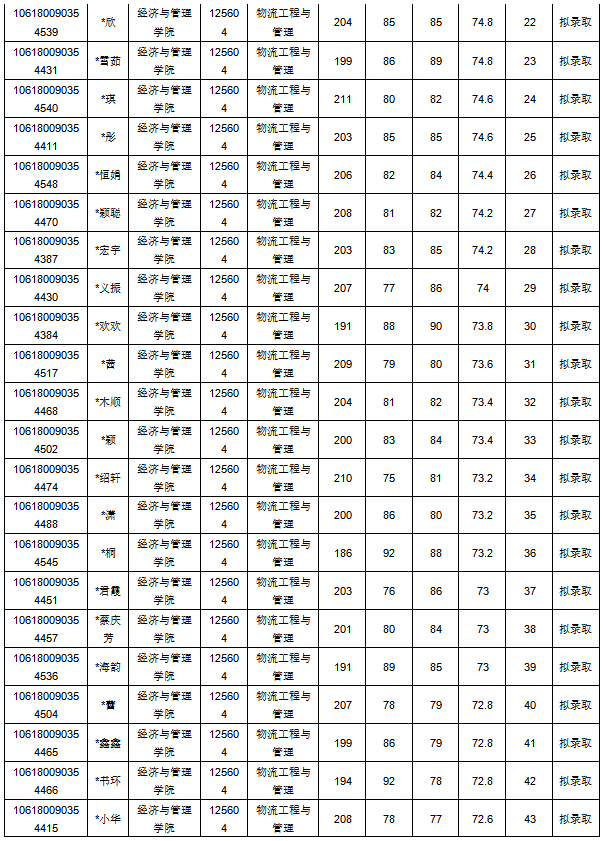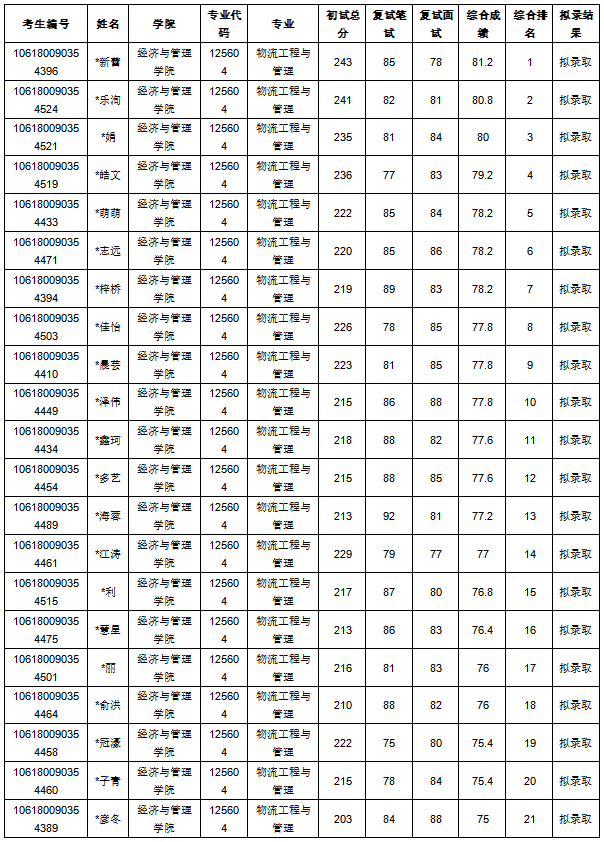 近日,全國(guó)各大研究生院校已公布2020研究生擬錄取名單。2020年研究生擬錄取名單不僅對(duì)于2020考研的同學(xué)很重要,對(duì)于2021考研的同學(xué)也很重要。2021考研的小伙伴可以通過(guò)2020年擬錄取名單分析今年的考情,從而做出最適合自己的考研決策。今天小編就整理了“2020物流工程與管理擬錄取名單:重慶交通大學(xué)物流工程與管理(125604)擬錄取名單公示”的相關(guān)內(nèi)容,希望能對(duì)大家有所幫助。