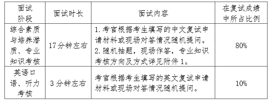 面試成績:滿分100分。面試形式:個人面試,由考官組面試一位考生。面試分兩個階段,分別為:綜合素質與培養潛質、專業知識考核;英語口語、聽力考核。
