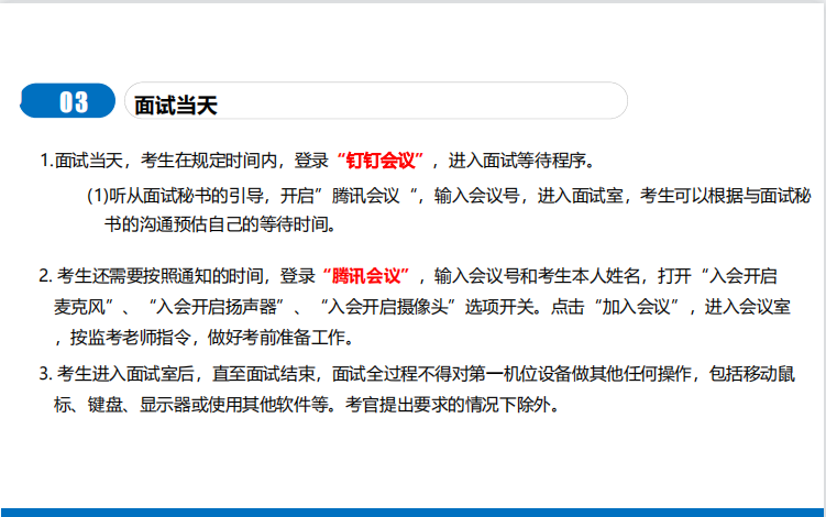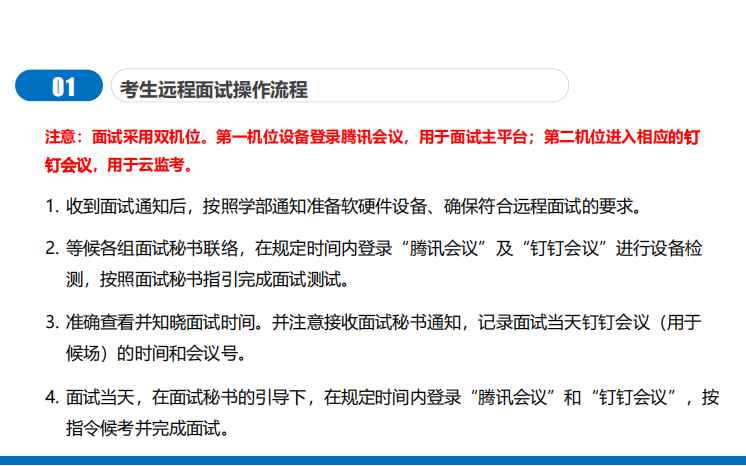 (二)面試方式:采取網絡遠程面試方式。考生用第一機位設備登錄騰訊會議,參加視頻面試;第二機位設備接入釘釘-會議,接受云監考。