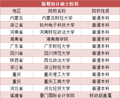 2018年3月22日,教育部發(fā)布了《國(guó)務(wù)院學(xué)位委員會(huì)關(guān)于下達(dá)2017年審核增列的博士、碩士學(xué)位授權(quán)點(diǎn)名單的通知》,明確提到的新增審計(jì)碩士院校共計(jì)12所,具體名單如下: