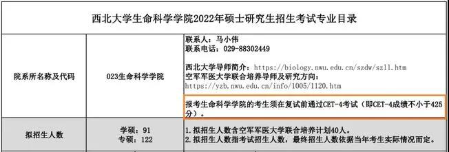 西北大學招生目錄具體要求中明確表示:報考生命科學學院的考生須在復試前通過CET-4考試(即CET-4成績不小于425)。