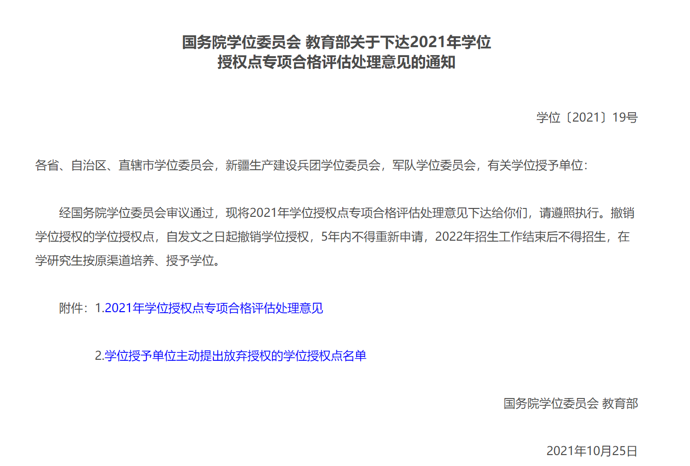 2019年,教育部下發了《國務院學位委員會教育部關于下達2018年學位授權點專項評估結果及處理意見的通知》。通知公布了2018年學位授權點專項評估結果和學位授予單位主動提出放棄授權的學位授權點名單