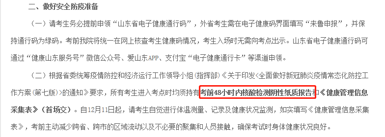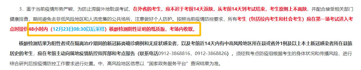 所有考生(包括校內考生和社會考生)應在第一場考試進入考點時提供48小時內(12月23日08:30以后采樣)核酸檢測陰性證明的紙質版,考場內收取。所以小伙伴一定要提前準備好,以防進不去考場。