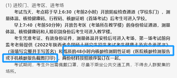 考生憑準考證、有效身份證件,測量體溫并安檢后可進入考場,第一場考試前向監考老師提供《2022年陜西省全國碩士研究生招生考試考生健康卡及安全承諾書》(須填寫完整并手寫簽名)和紙質的48小時內核酸檢測陰性證明(醫院核酸檢測報告或手機核酸報告截圖打印),兩份材料按照順序裝訂在一起。