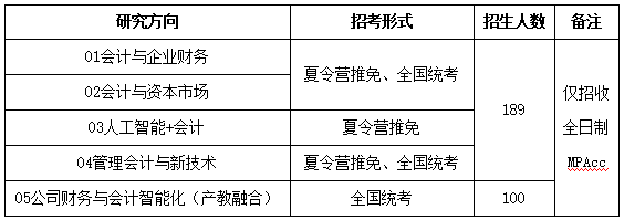 說明:01-04方向全程由會計學院進行培養。其中,01-04方向不區分招生人數,合計擬招收189人(含123名推免生)。05方向第一年在北京學習,第二年在廣州中央財經大學粵港澳大灣區(黃埔)研究院開展產教融合實習實踐。