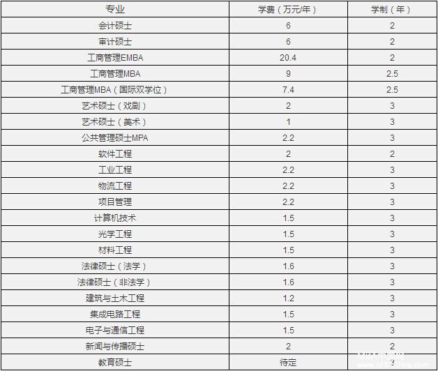 按物價部門批準或備案標準收取,其中會計碩士(非定向)3萬元/年(學制2年),會計碩士(定向)5萬年/年(學制2年),軟件工程2萬元/年(學制2年),藝術碩士(戲劇)2萬元/年(學制3年),藝術碩士(美術)1.5萬元/年(學制3年),其他類別、領域1萬元/年。