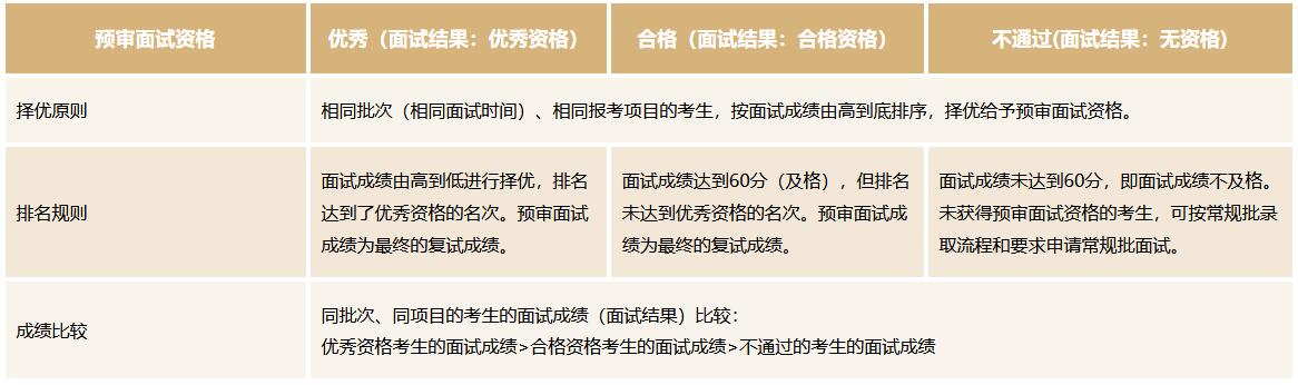 4、獲得預審面試資格的考生,其預審面試成績為最終的復試成績,即錄取總成績中的復試成績(總成績 = 初試成績 ÷ 3 × 50% + 復試成績(百分制) × 50%)。此類考生無須重復申請聯考后的復試,即常規批面試。