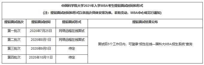 2、2020年7月至10月,中國科學院大學MBA教育管理中心將組織專家組,對網上提交提前面試申請的考生進行綜合評估審核 ,在審核截止之前考生可繼續提交提前面試申請。