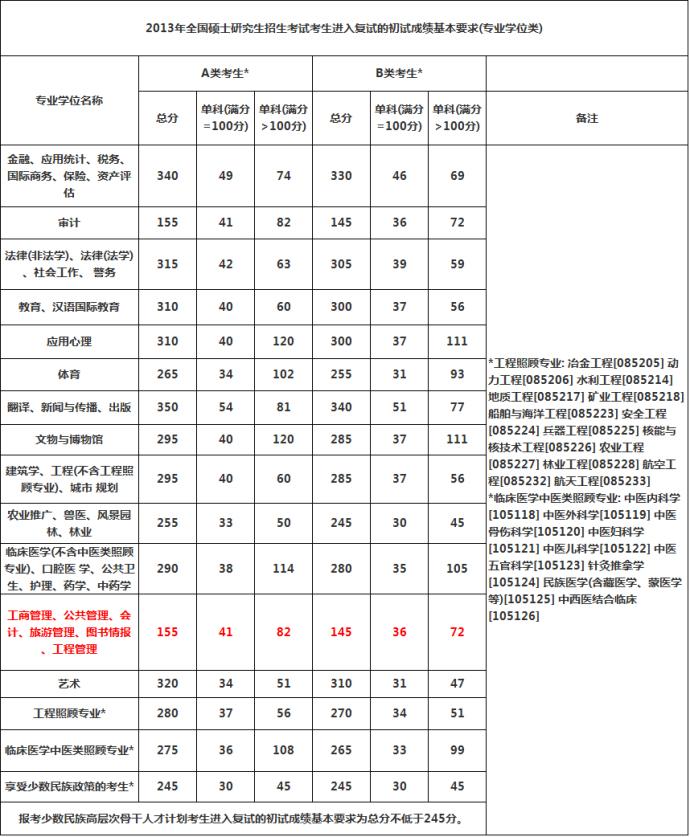 2013年工商管理碩士A類院校總分為155分 B類院校總分為145分,詳情請見下表: