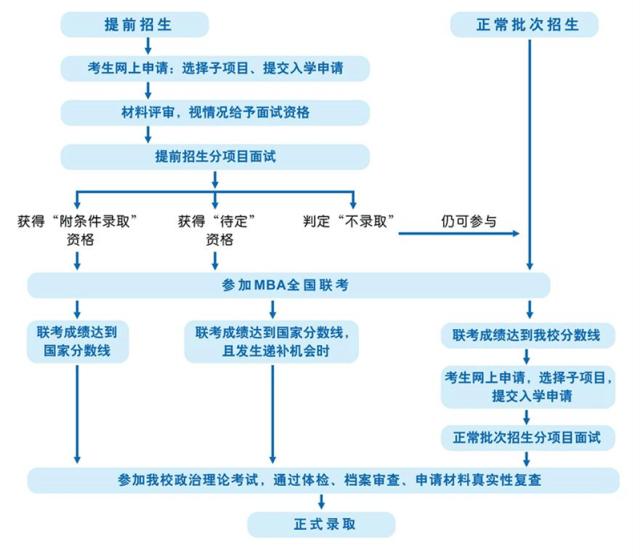 2. 招生形式分為提前批次招生和正常批次招生兩種類型,提前批次招生適用于:①申請國際MBA項目(全日制)的考生,名額占該子項目招生人數≧70%;②申請國際MBA項目(在職英文)的考生,名額占該子項目招生人數≧70%;③申請在職MBA項目(在職中文)的考生,名額占該子項目招生人數≧70%。EMBA項目不參與提前批次招生。