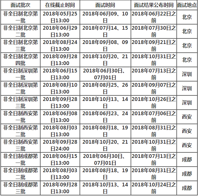 2019年非全日制MBA北京項(xiàng)目、深圳項(xiàng)目、西安項(xiàng)目、成都項(xiàng)目共設(shè)有13個(gè)申請(qǐng)批次,請(qǐng)申請(qǐng)人按規(guī)定時(shí)間在線提交材料;MBA項(xiàng)目根據(jù)申請(qǐng)人的材料進(jìn)行評(píng)審后,定期組織面試。