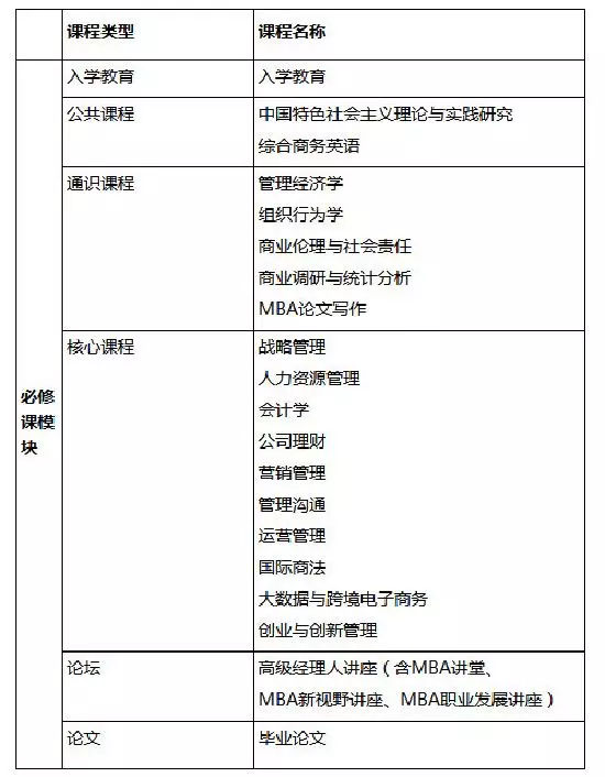 課程分為必修課及選修課兩大類:必修課包括5大模塊(公共課程模塊、通識(shí)課程模塊、核心課程模塊、論壇模塊),選修課包括“財(cái)務(wù)管理模塊、人力資源管理模塊、營銷管理模塊、運(yùn)營管理模塊、“一帶一路”模塊、實(shí)驗(yàn)實(shí)踐教學(xué)模塊”